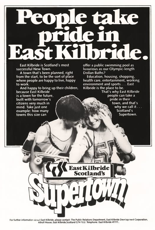 In the latter years of the 1970s a nationwide survey named East Kilbride as ‘Britain’s most successful new town in industrial development’ and boasted impressive figures in all other available categories in the years before and after the survey. At that time 200 businesses were operating from factories within the town, and held the record of being second of all locations across the UK with 17,973 houses being built, as well as 82 commercial offices being created. The East Kilbride Development Corporation wasted no time in adopting the slogan of ‘Britain’s Most Successful New Town’.