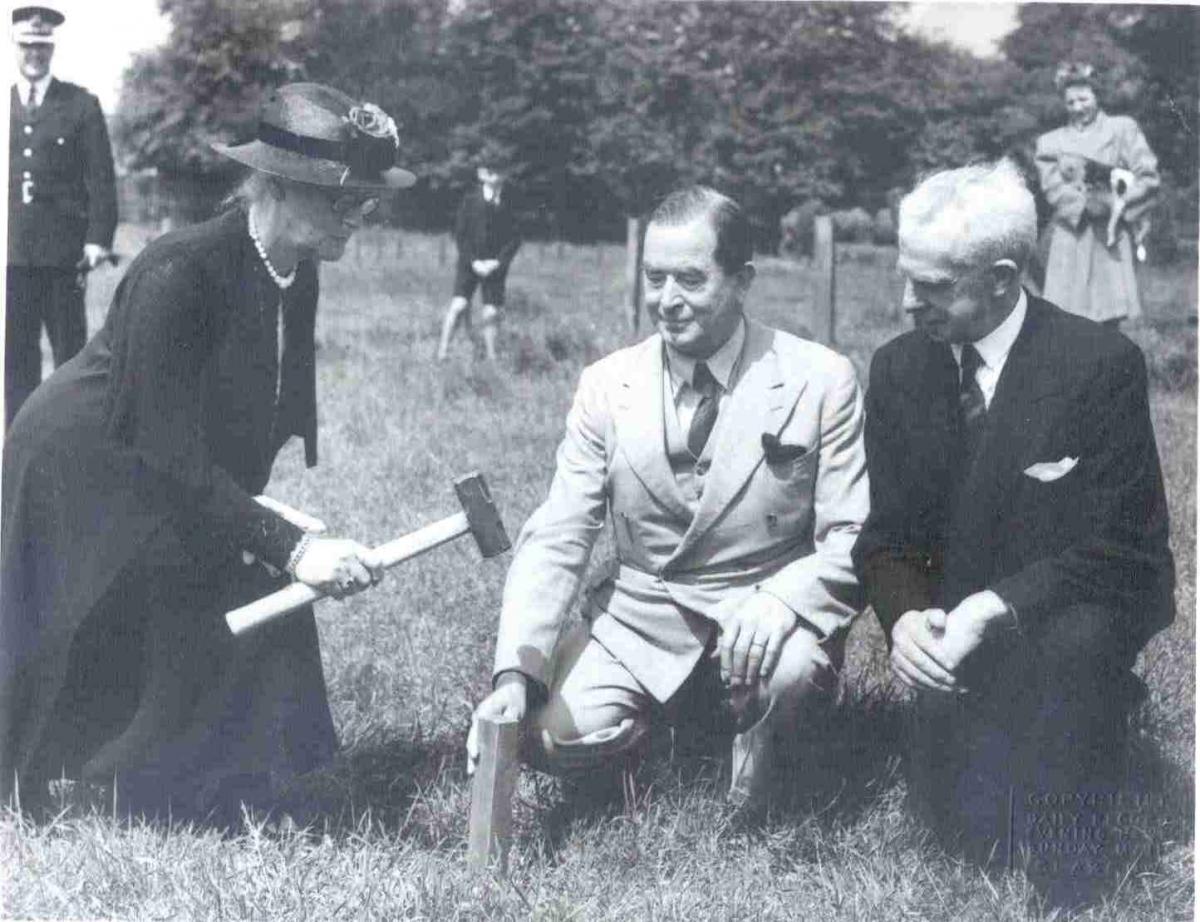 Planner Elizabeth Mitchell, with Arthur Woodburn and Sir Patrick Dollan hammering the first wooden stake of EK in 1947.